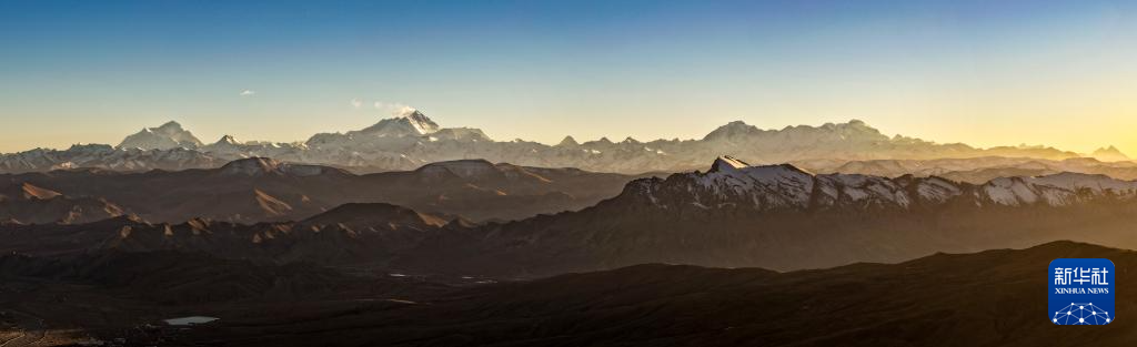11月13日黃昏在定日縣拍攝的喜馬拉雅山脈,自左至右的高峰分別是洛子峰、珠穆朗瑪峰、卓奧友峰和希夏邦馬峰(無(wú)人機(jī)照片)。新華社記者 姜帆 攝
