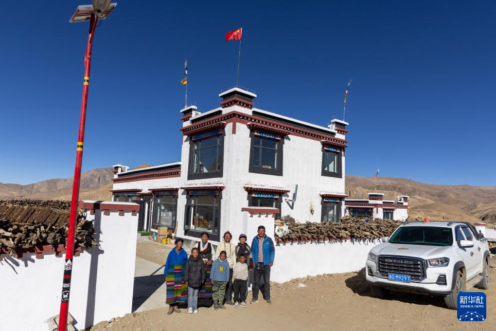 西藏定日縣曲洛鄉(xiāng)熱木青村村民尼瑪平措(右一)一家在新房和自家的汽車前拍照(11月12日攝)。新華社記者 姜帆 攝
