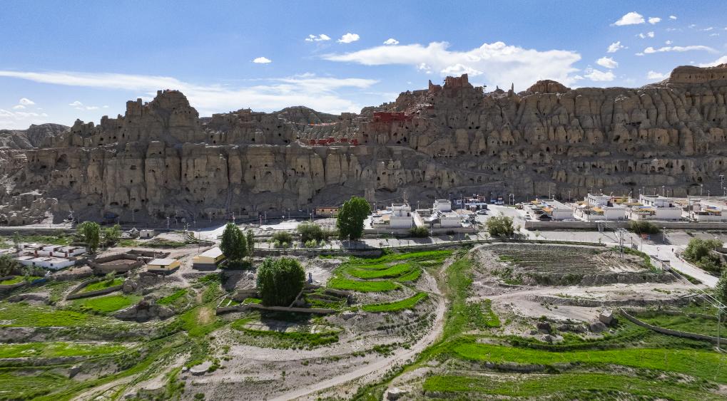 皮央石窟群與山下的村莊相互映襯(無(wú)人機(jī)照片)。新華社記者 丁增尼達(dá) 攝