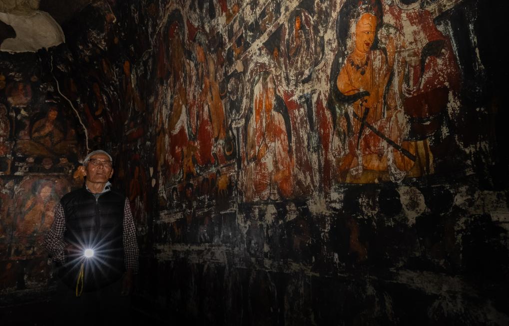 強(qiáng)巴次仁倚著洞口,聽(tīng)著仁增旺扎的講解,瞇著眼望向那些畫(huà)。他看不太清壁畫(huà)的細(xì)節(jié)了,但半輩子的守護(hù),已讓壁畫(huà)像是他生活的一部分——也是他所理解世界的一部分。