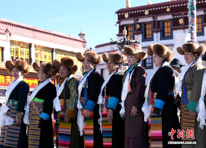 圖為拉薩婦女盛裝在大昭寺廣場合影。中新社記者 李林 攝