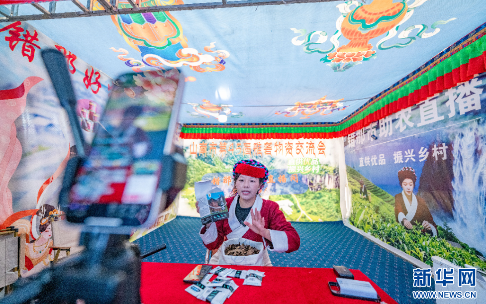 12月1日,一位電商主播在西藏自治區(qū)山南市第45屆雅礱物資交流會(huì)現(xiàn)場介紹產(chǎn)品。新華網(wǎng) 旦增努布 攝