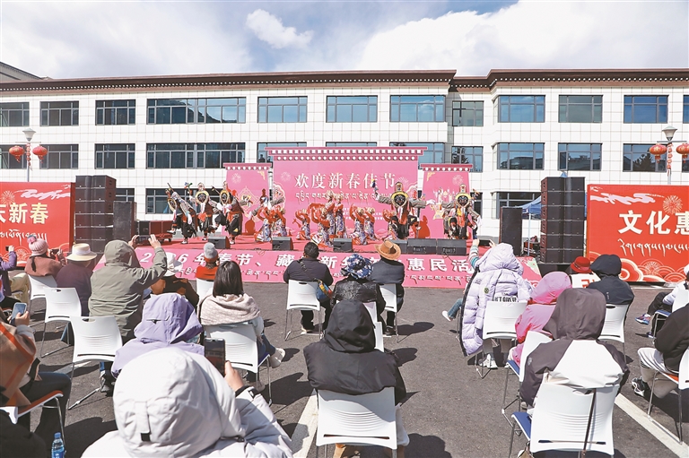 隨后,在社區(qū)劇場(chǎng)內(nèi),雅礱扎西雪巴藏戲精彩上演。演員們頭戴面具、身著華麗戲服,以高亢嘹亮的唱腔和富有張力的動(dòng)作,演繹著古老傳說。舞臺(tái)下,游客們或舉起手機(jī)記錄精彩瞬間,或隨著節(jié)奏輕輕拍手,沉浸在這場(chǎng)獨(dú)具藏式風(fēng)情的“村晚”之中,劇場(chǎng)里洋溢著歡樂祥和的節(jié)日氛圍。