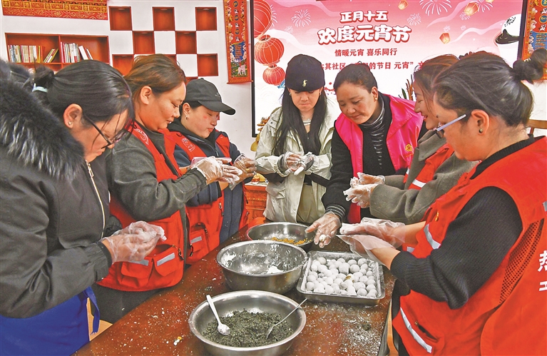圖為拉薩市城關(guān)區(qū)吉崩崗街道熱木其社區(qū)群眾和社區(qū)工作人員正在包湯圓。記者 旦增蘭澤 攝