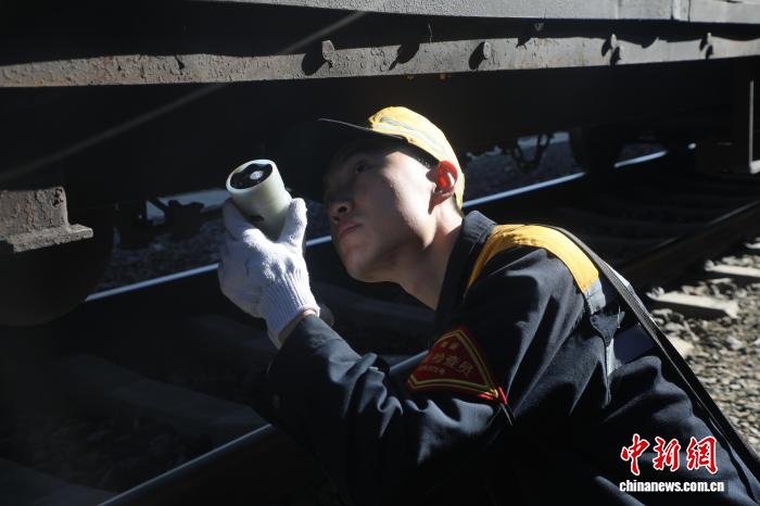 柴超來自吉林長春,鄧桓來自甘肅張掖,同齡同崗,一北一西,跨越千里相聚高原,在元宵佳節(jié)默契守護貨運列車的安全?!皟尚值堋笔种缚诤簟?道信息匹配正確,核對無誤,開始檢查車輛”,倆人分別在兩側(cè)拿著編組一輛輛車輛逐個核對車號、貨物裝載加固等情況,每一個動作規(guī)范利落,重點車標(biāo)記上鮮明的記號,目光如炬般看著視頻排查著可能存在的安全隱患。
