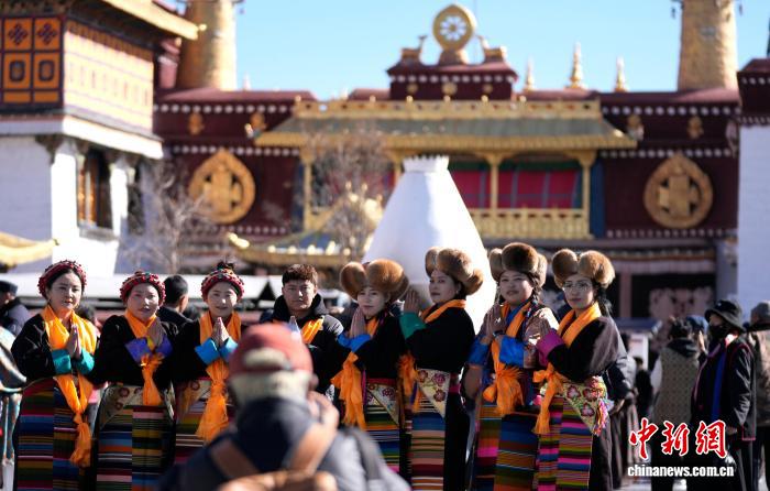 圖為拉薩婦女盛裝在大昭寺廣場拍照。中新社記者 李林 攝