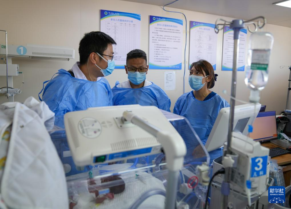 在那曲市人民醫(yī)院新生兒重癥監(jiān)護室,來自大連醫(yī)科大學附屬第一醫(yī)院的援藏醫(yī)生田聰亮(左)與吉美多布杰(中)、護士旦珍合作,為一名早產(chǎn)兒實施機械通氣治療(7月18日攝)。吉美多布杰2003年從四川大學華西醫(yī)學院畢業(yè)來到那曲市人民醫(yī)院工作,他先后和8批援藏專家合作、學習。新華社記者 晉美多吉 攝 ??