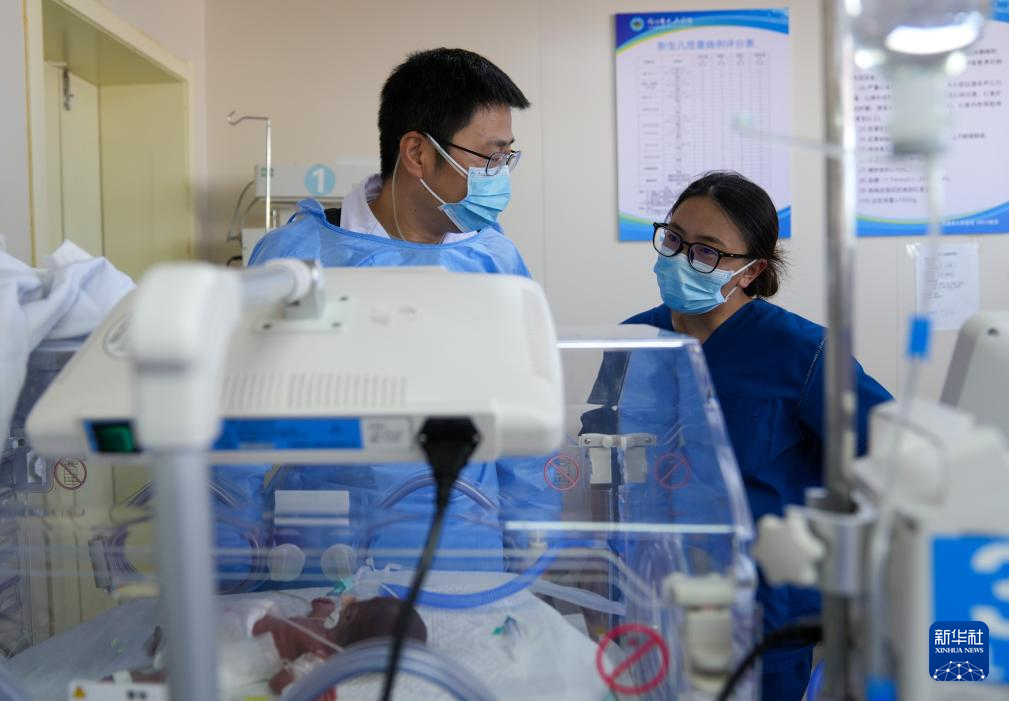 在那曲市人民醫(yī)院新生兒重癥監(jiān)護室,來自大連醫(yī)科大學附屬第一醫(yī)院的援藏醫(yī)生田聰亮(左)和護士旦珍合作為一名早產(chǎn)兒實施機械通氣治療(7月18日攝)。新華社記者 晉美多吉 攝 ??