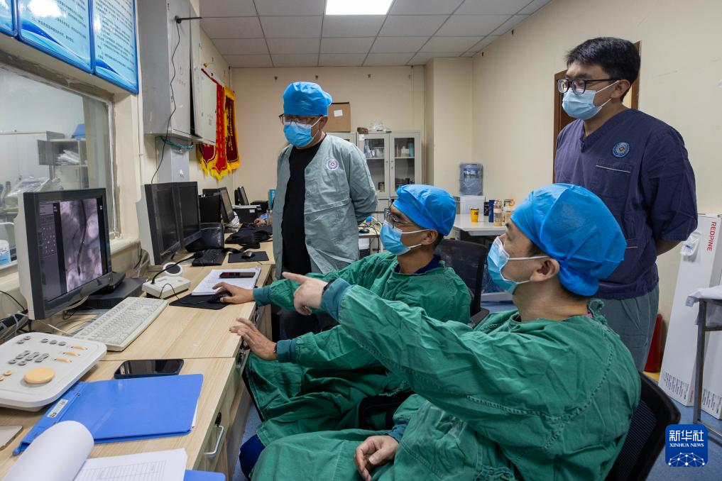 ?協(xié)和醫(yī)院第十批援藏醫(yī)生王強(左四)、第十一批援藏醫(yī)生蔣青偉(左三)和西藏自治區(qū)人民醫(yī)院醫(yī)生扎西(左一)在拉薩為患者施行內(nèi)鏡逆行胰膽管造影術(shù)(8月5日攝)。新華社記者 姜帆 攝 ??