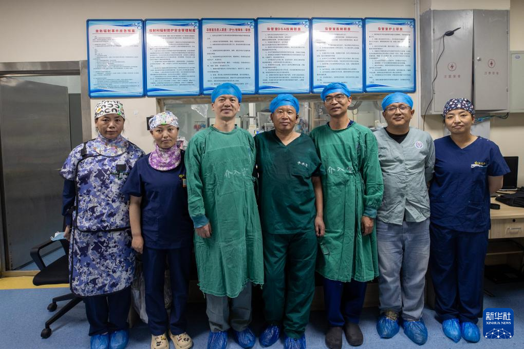 協(xié)和醫(yī)院第十批援藏醫(yī)生王強(右三)、第十一批援藏醫(yī)生蔣青偉(左三)和西藏自治區(qū)人民醫(yī)院醫(yī)生扎西(中)、旦增索朗(右二)及手術(shù)團隊,在拉薩為患者施行內(nèi)鏡逆行胰膽管造影術(shù)后合影(8月5日攝)。新華社記者 姜帆 攝 ??