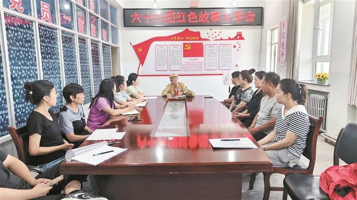 在四師六十六團(tuán)舉辦的紅色故事分享會(huì)上,老戰(zhàn)士宣講團(tuán)成員閆欣秋為職工群眾講述兵團(tuán)故事(攝于7月17日)。 兵團(tuán)日?qǐng)?bào)常駐記者 李惠 通訊員 武淑洋 攝