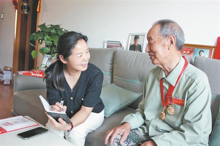 四師可克達(dá)拉市融媒體中心記者在采訪四師六十六團(tuán)老戰(zhàn)士宣講團(tuán)成員趙文秋(右)(攝于8月20日)。閆欣秋 攝